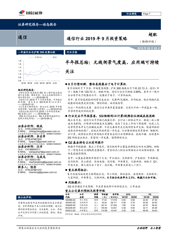 【国信证券】【20190903】通信行业2019年9月投资策略:半年报总结:无线侧景气度高,应用端可持续关注-13页