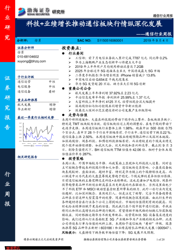【渤海证券】【20190904】通信行业周报:科技+业绩增长推动通信板块行情纵深化发展-20页