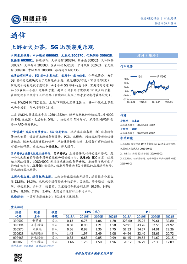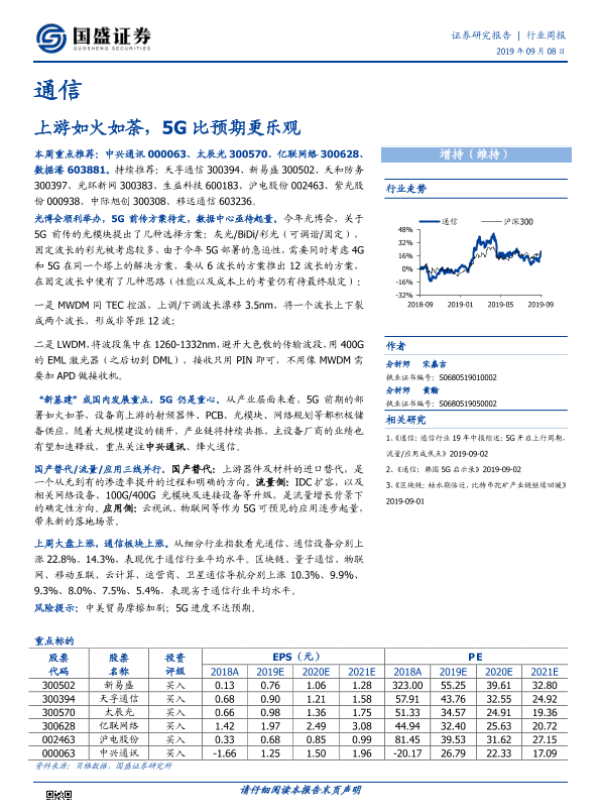 【国盛证券】【20190908】通信行业周报:上游如火如荼,5G比预期更乐观-9页