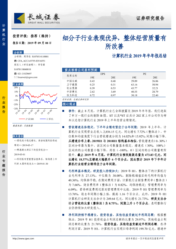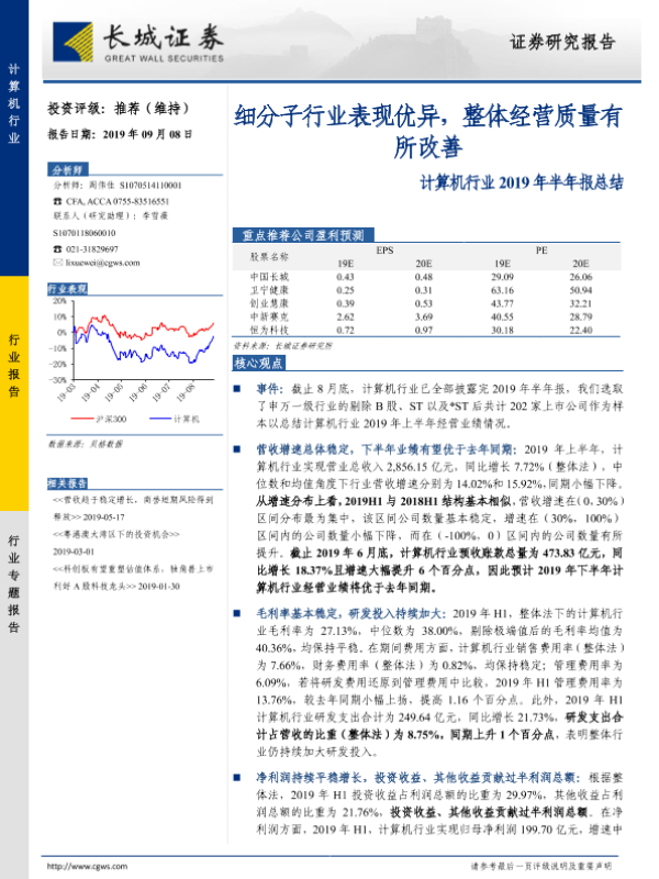 【长城证券】【20190908】计算机行业2019年半年报总结:细分子行业表现优异,整体经营质量有所改善-17页