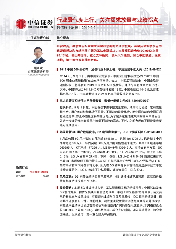 【中信证券】【20190909】通信行业周报:行业景气度上行,关注需求放量与业绩拐点-8页