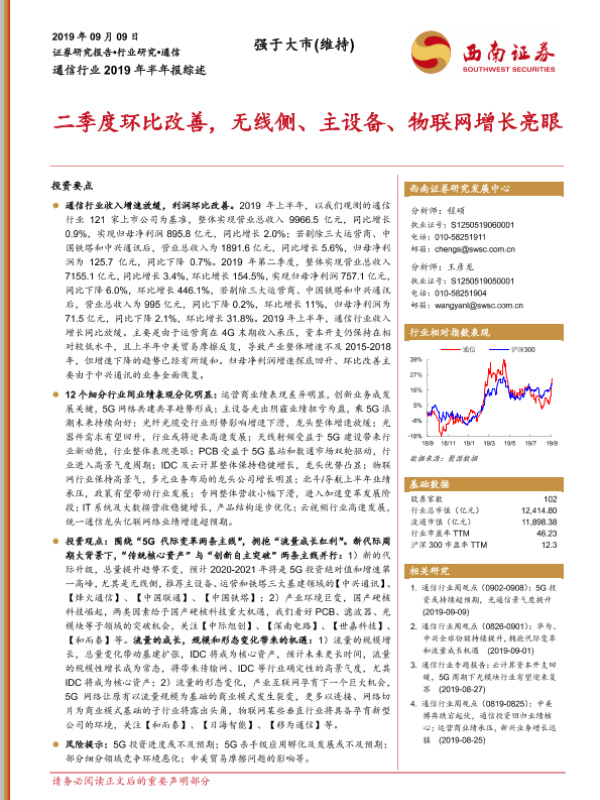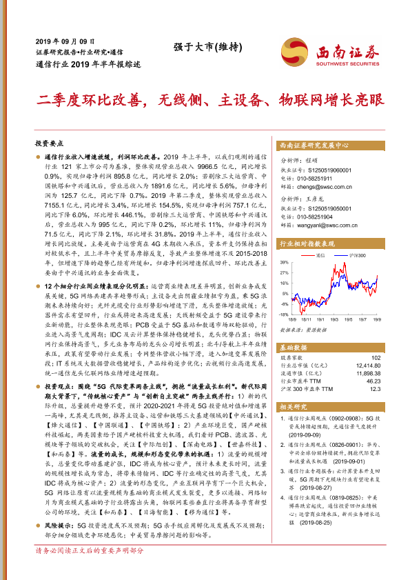【西南证券】【20190909】通信行业2019年半年报综述:二季度环比改善,无线侧、主设备、物联网增长亮眼-29页