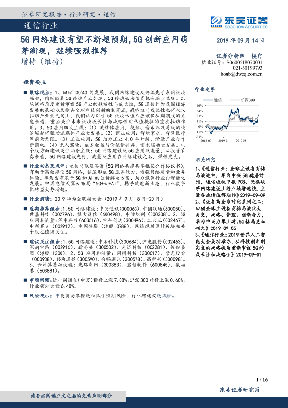 【东吴证券】【20190914】通信行业跟踪周报:5G网络建设有望不断超预期,5G创新应用萌芽渐现,继续强烈推荐-16页