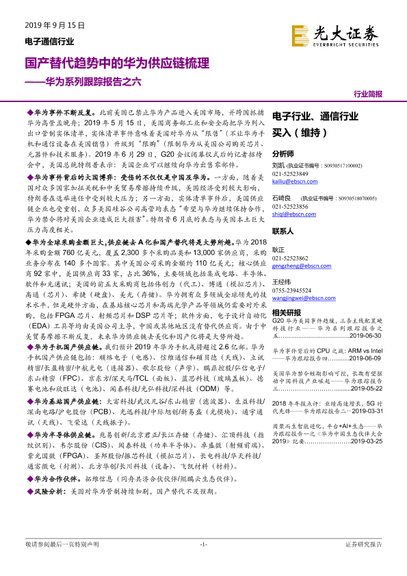 【光大证券】【20190915】电子通信行业国产替代趋势中的华为供应链梳理——华为系列跟踪报告之六-6页