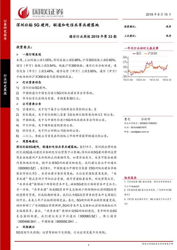 【国联证券】【20190915】20190915-国联证券-通信行业周报2019年第33期:深圳补贴5G建网,联通和电信共享共建落地-10页