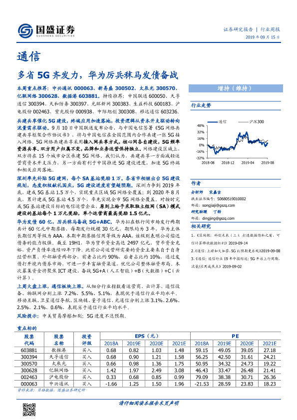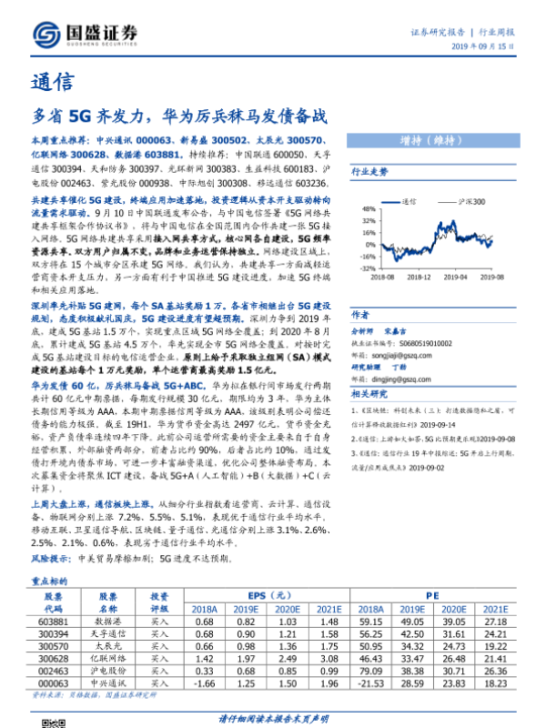 【国盛证券】【20190915】通信行业周报:多省5G齐发力,华为厉兵秣马发债备战-9页