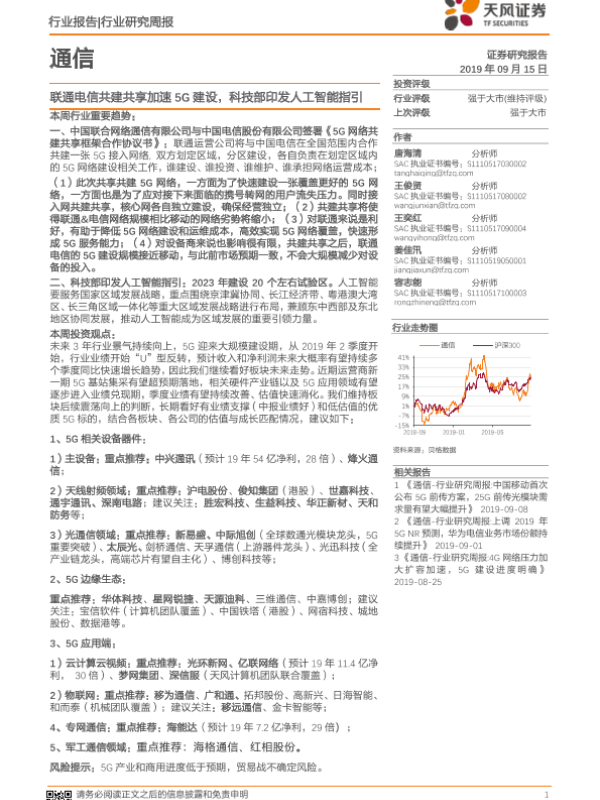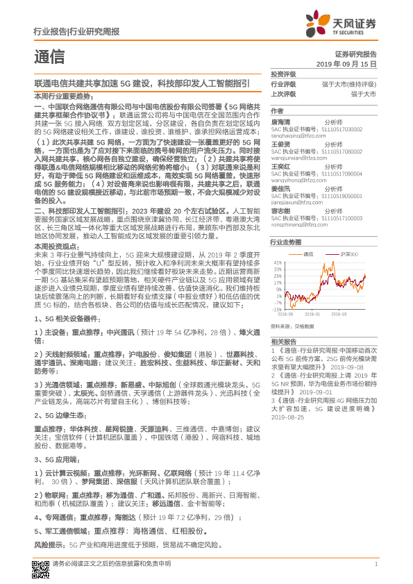 【天风证券】【20190915】通信行业研究周报:联通电信共建共享加速5G建设,科技部印发人工智能指引-20页