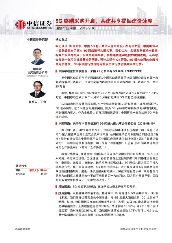 【中信证券】【20190916】通信行业周报:5G终端采购开启,共建共享提振建设速度-10页