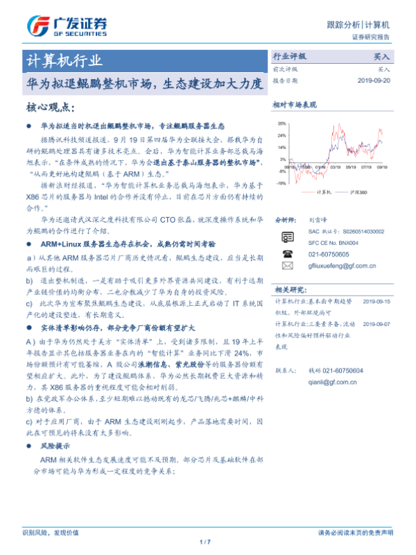 【广发证券】【20190920】计算机行业跟踪分析:华为拟退鲲鹏整机市场,生态建设加大力度-7页