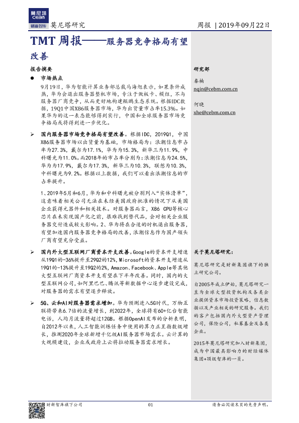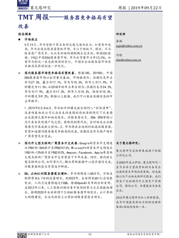 【莫尼塔研究】【20190922】TMT周报——服务器竞争格局有望改善-6页