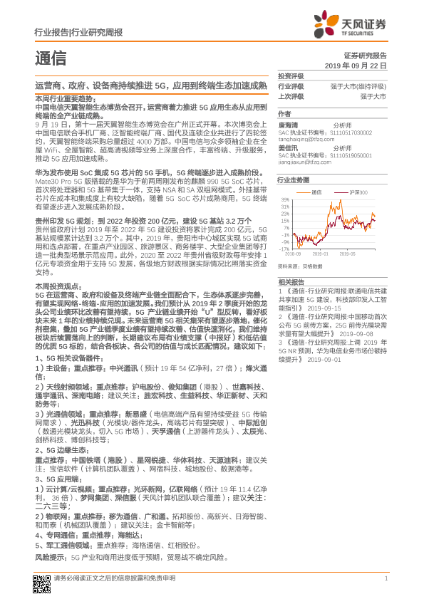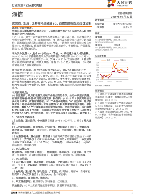 【天风证券】【20190922】通信行业研究周报:运营商、政府、设备商持续推进5G,应用到终端生态加速成熟-18页