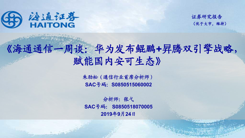 【海通证券】【20190924】海通通信一周谈:华为发布鲲鹏+昇腾双引擎战略,赋能国内安可生态-10页