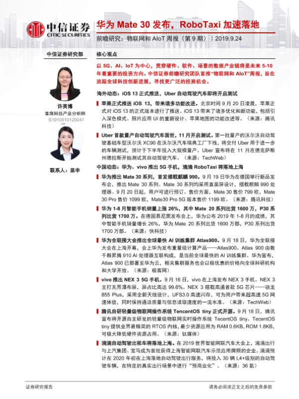【中信证券】【20190924】物联网和AIoT周报(第9期):华为Mate 30发布,RoboTaxi加速落地-5页