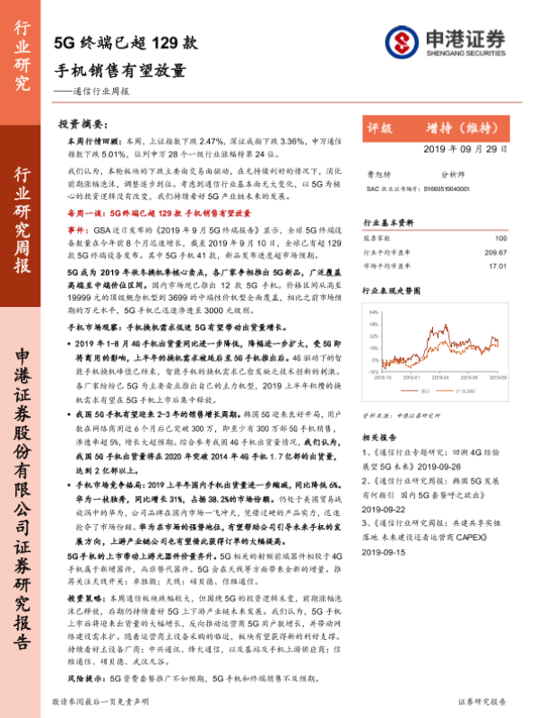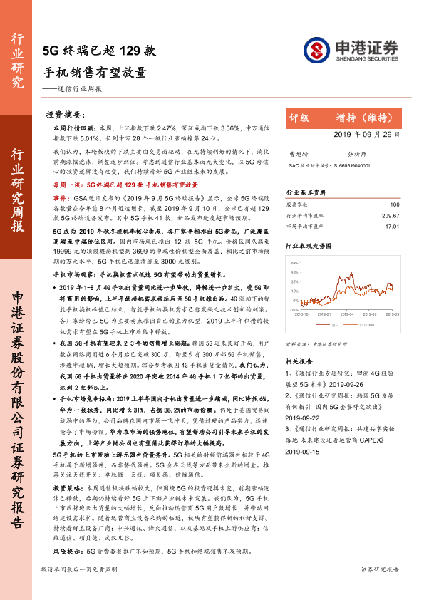 【申港证券】【20190929】通信行业周报:5G终端已超129款 手机销售有望放量-15页