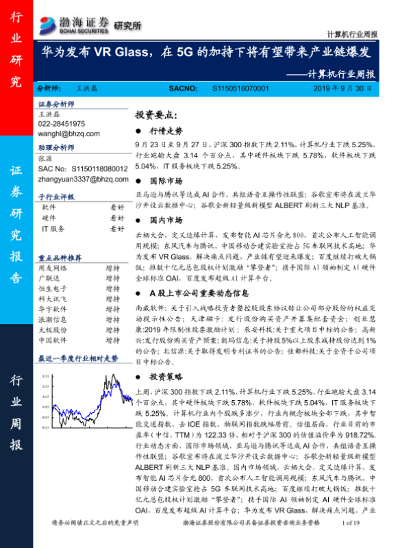 【渤海证券】【20190930】计算机行业周报:华为发布VR Glass,在5G的加持下将有望带来产业链爆发-19页