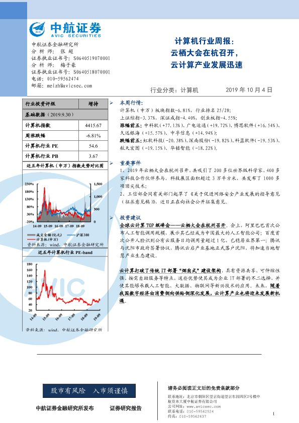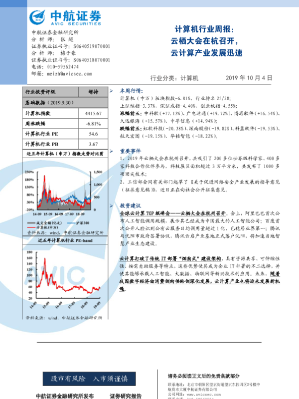 【中航证券】【20191004】计算机行业周报:云栖大会在杭召开,云计算产业发展迅速-3页