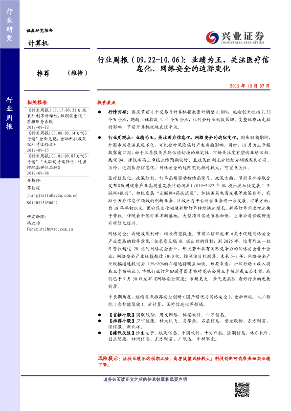 【兴业证券】【20191007】行业周报(09.22-10.06):业绩为王,关注医疗信息化、网络安全的边际变化-21页