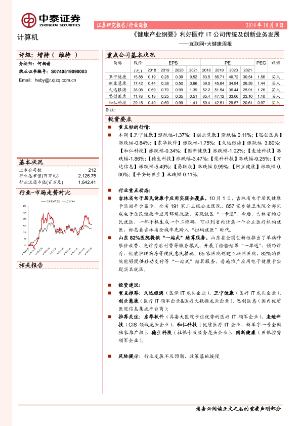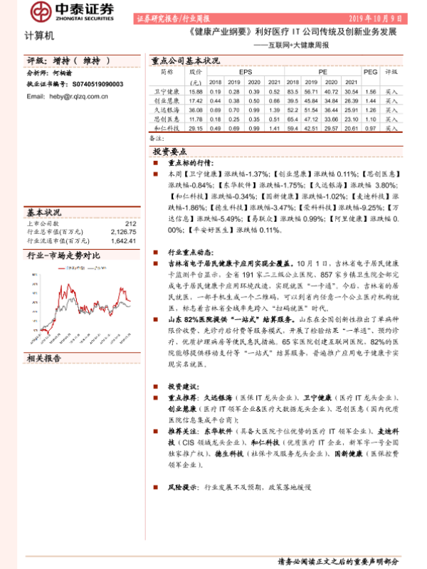 【中泰证券】【20191009】互联网+大健康周报:《健康产业纲要》利好医疗IT公司传统及创新业务发展-10页