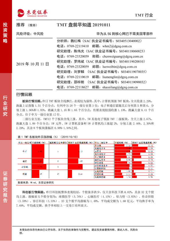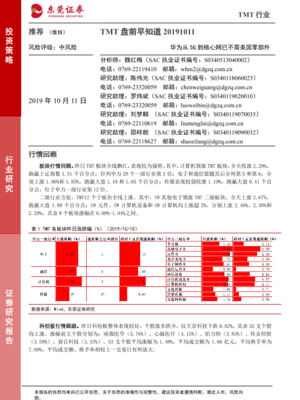 【东莞证券】【20191011】TMT盘前早知道:华为从5G到核心网已不需美国零部件-5页