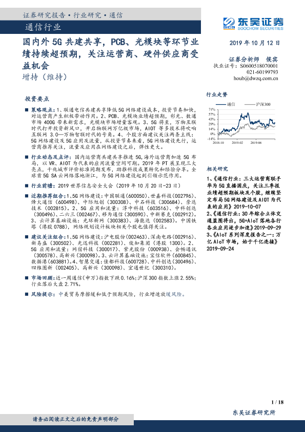 【东吴证券】【20191012】通信行业:国内外5G共建共享,PCB、光模块等环节业绩持续超预期,关注运营商、硬件供应商受益机会-18页