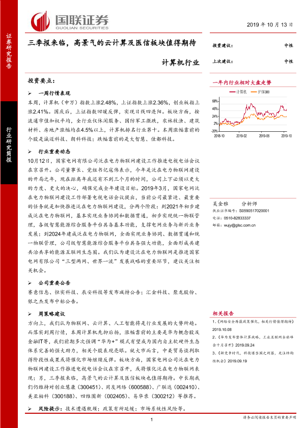 【国联证券】【20191013】计算机行业:三季报来临,高景气的云计算及医信板块值得期待-15页