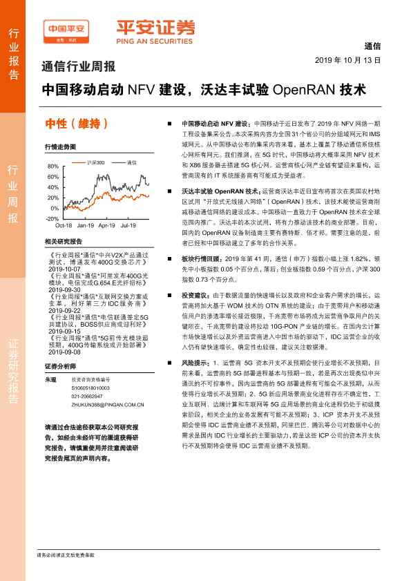 【平安证券】【20191013】通信行业周报:中国移动启动NFV建设,沃达丰试验OpenRAN技术-5页