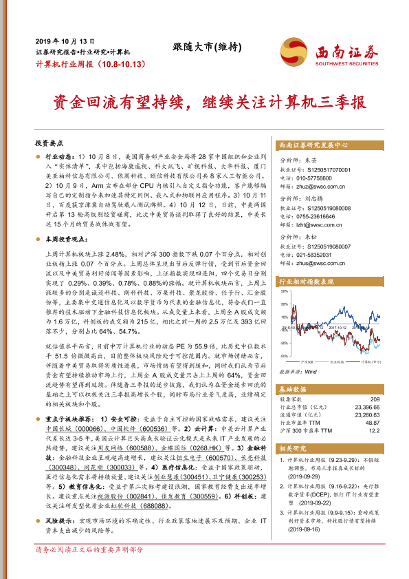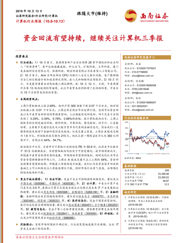 【西南证券】【20191013】计算机行业周报:资金回流有望持续,继续关注计算机三季报-16页