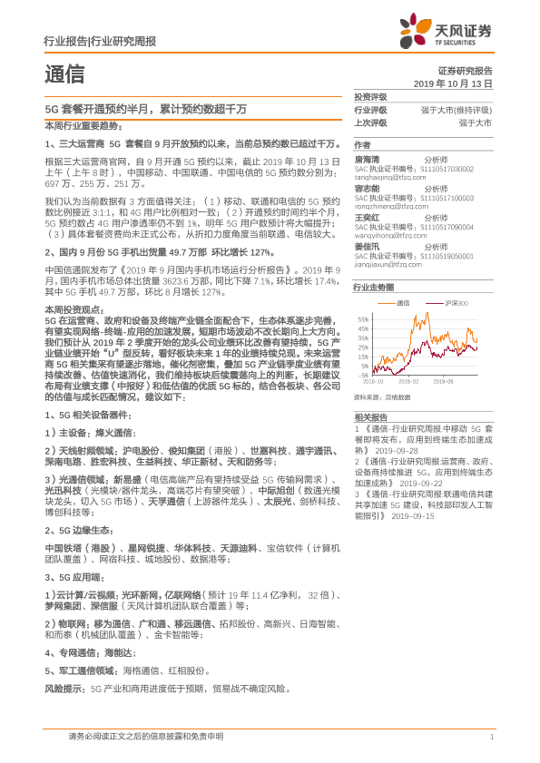 【天风证券】【20191013】通信行业研究周报:5G套餐开通预约半月,累计预约数超千万-20页