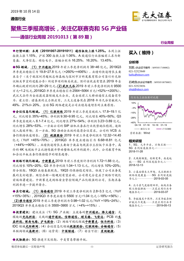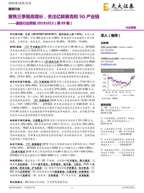 【光大证券】【20191014】通信行业周报(第89期):聚焦三季报高增长,关注亿联赛克和5G产业链-7页