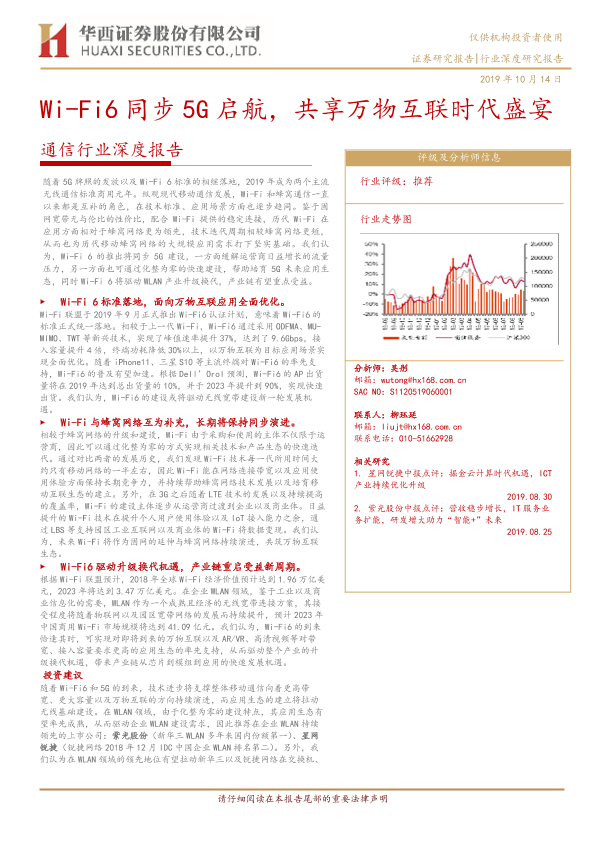 【华西证券】【20191014】通信行业深度报告:Wi-Fi6同步5G启航,共享万物互联时代盛宴-45页