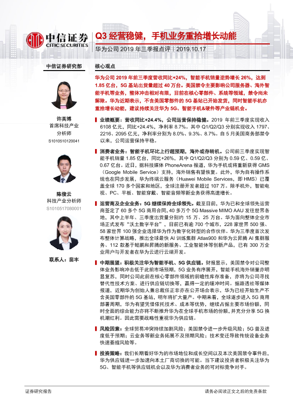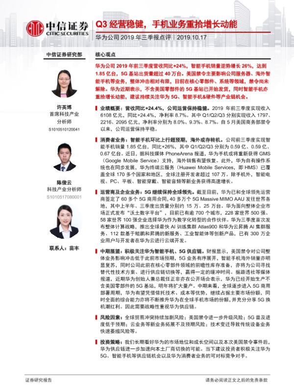 【中信证券】【20191017】华为公司2019年三季报点评:Q3经营稳健,手机业务重拾增长动能-3页