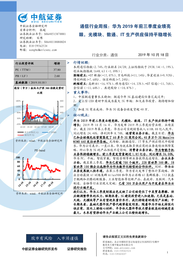 【中航证券】【20191018】通信行业周报:华为2019年前三季度业绩亮眼,光模块、数通、IT生产供应保持平稳增长-3页