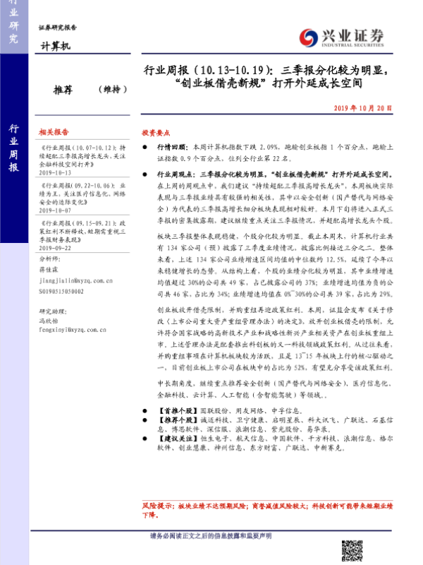 【兴业证券】【20191020】行业周报(10.13-10.19):三季报分化较为明显,“创业板借壳新规”打开外延成长空间-11页