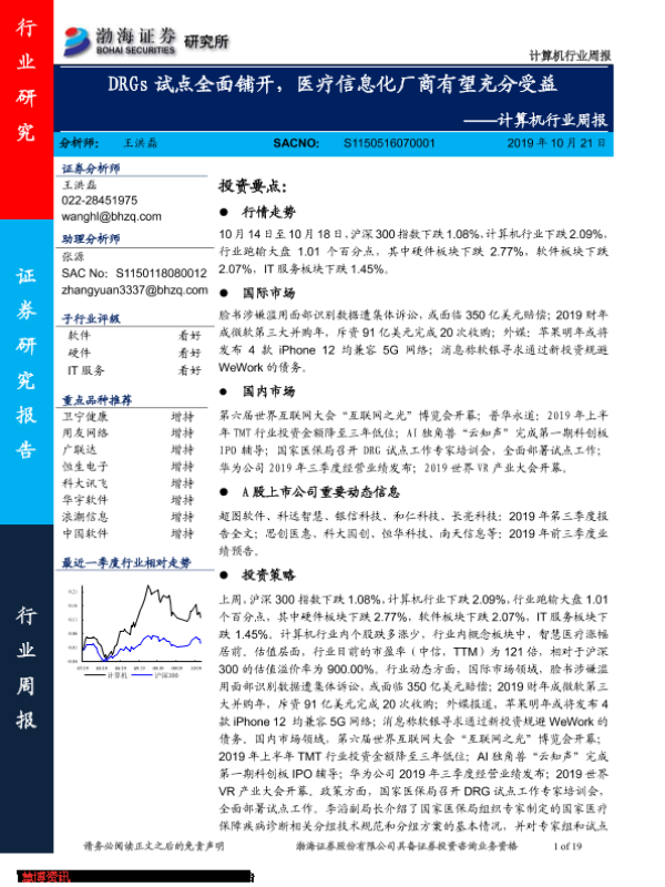 【渤海证券】【20191021】计算机行业周报:DRGs试点全面铺开,医疗信息化厂商有望充分受益-19页