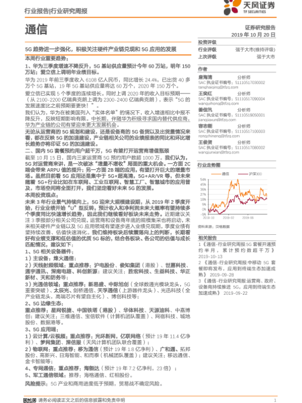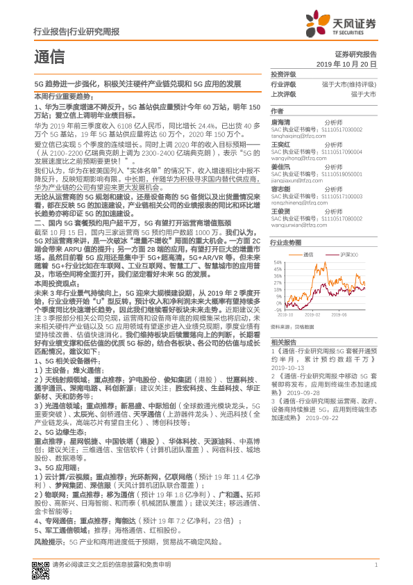 【天风证券】【20191020】通信行业研究周报:5G趋势进一步强化,积极关注硬件产业链兑现和5G应用的发展-17页