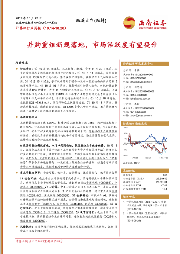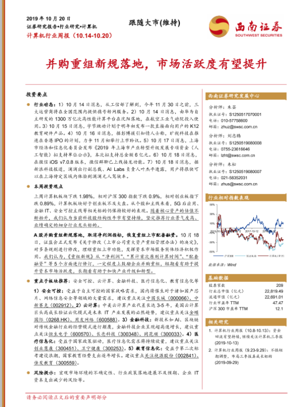 【西南证券】【20191020】计算机行业周报:并购重组新规落地,市场活跃度有望提升-21页