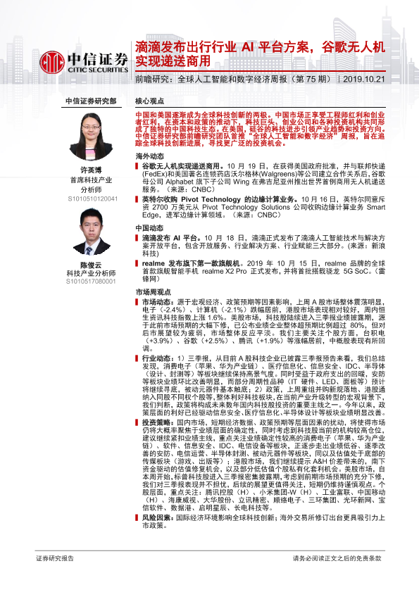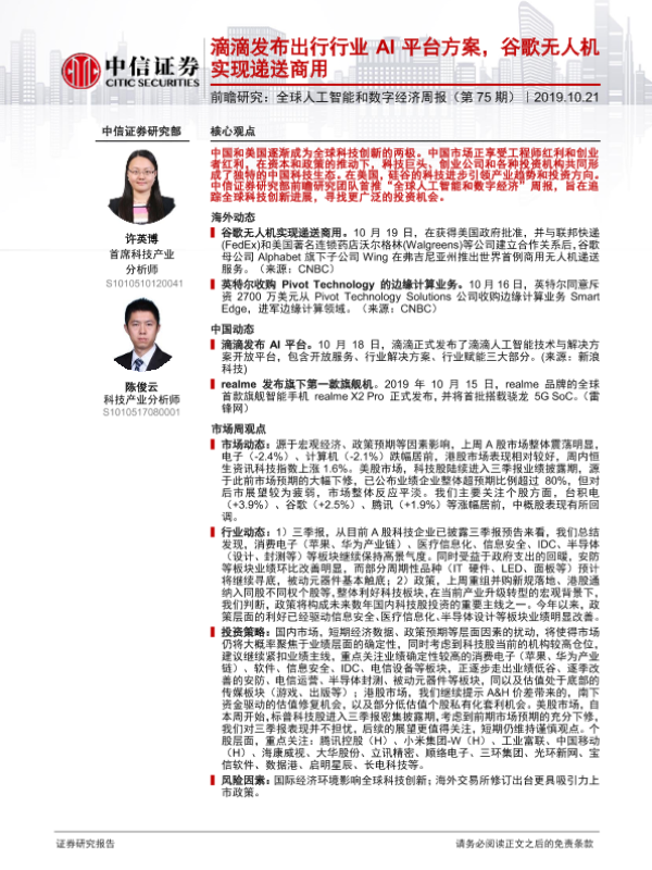 【中信证券】【20191021】全球人工智能和数字经济周报(第75期):滴滴发布出行行业AI平台方案,谷歌无人机实现递送商用-10页