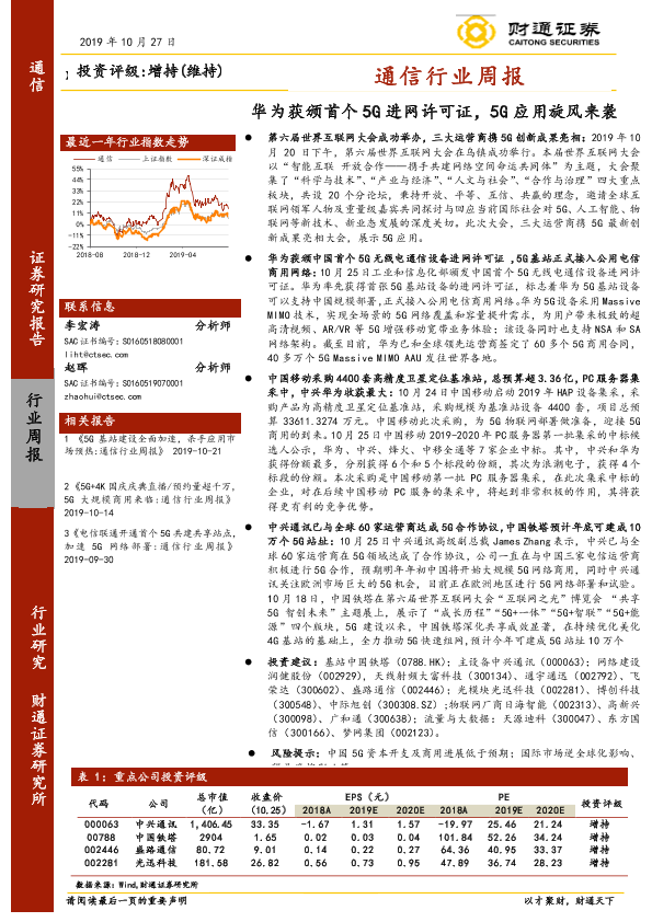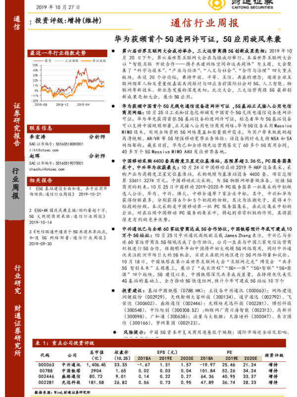 【财通证券】【20191027】通信行业周报:华为获颁首个5G进网许可证,5G应用旋风来袭-15页