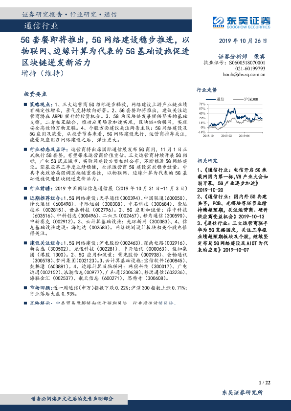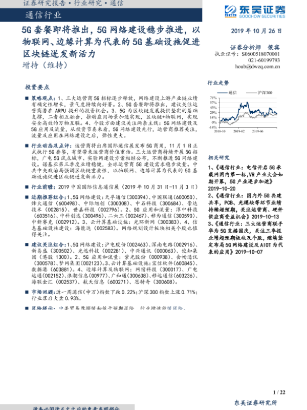 【东吴证券】【20191026】通信行业:5G套餐即将推出,5G网络建设稳步推进,以物联网、边缘计算为代表的5G基础设施促进区块链迸发新活力-22页