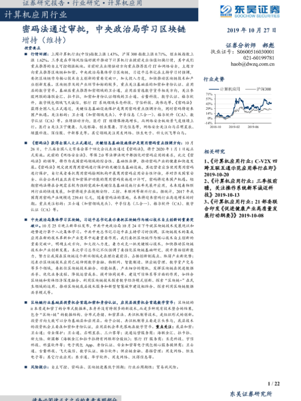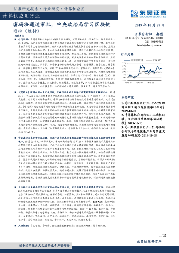 【东吴证券】【20191027】计算机应用行业:密码法通过审批,中央政治局学习区块链-22页