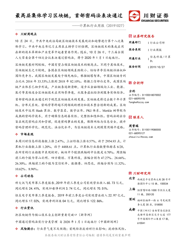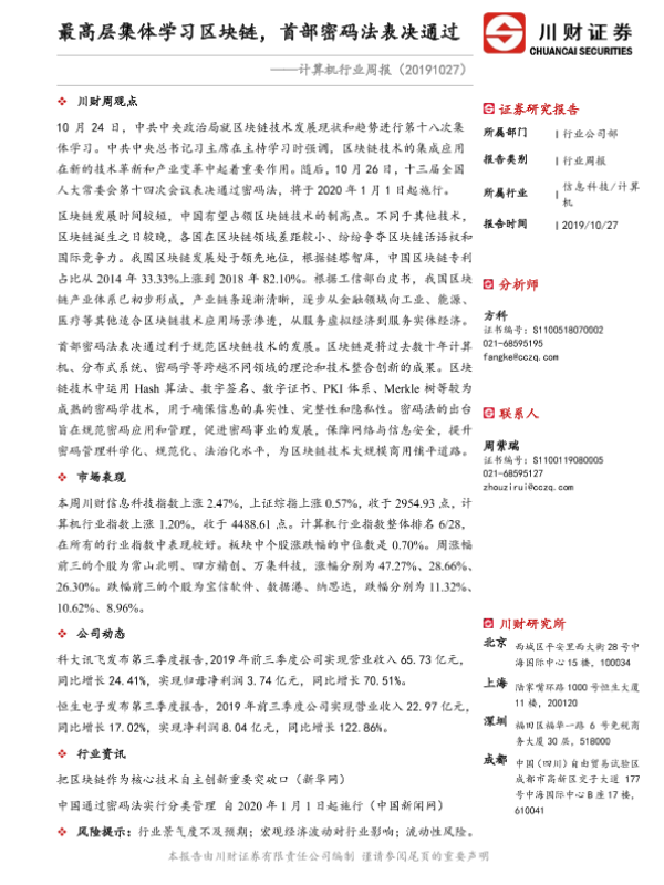 【川财证券】【20191027】计算机行业周报:最高层集体学习区块链,首部密码法表决通过-10页