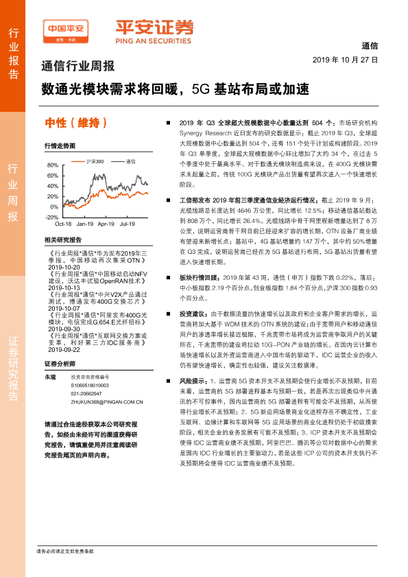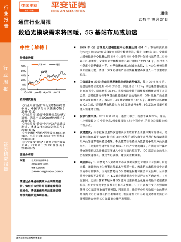 【平安证券】【20191027】通信行业周报:数通光模块需求将回暖,5G基站布局或加速-5页
