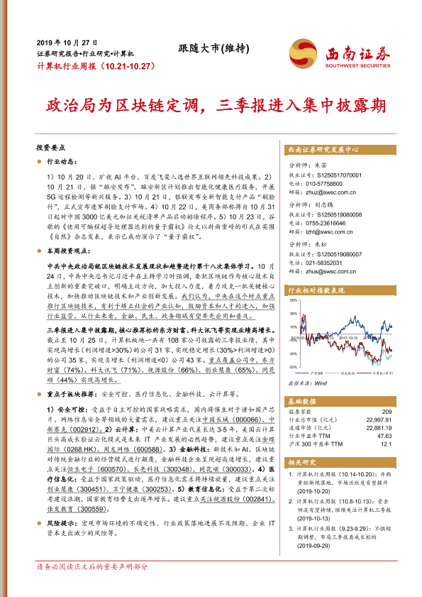 【西南证券】【20191027】计算机行业周报:政治局为区块链定调,三季报进入集中披露期-17页