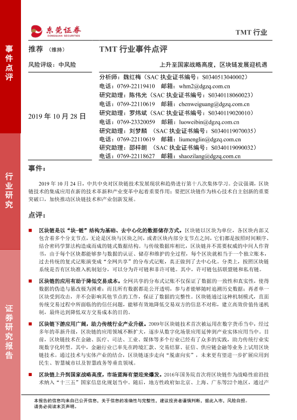 【东莞证券】【20191028】TMT行业事件点评:上升至国家战略高度,区块链发展迎机遇-3页