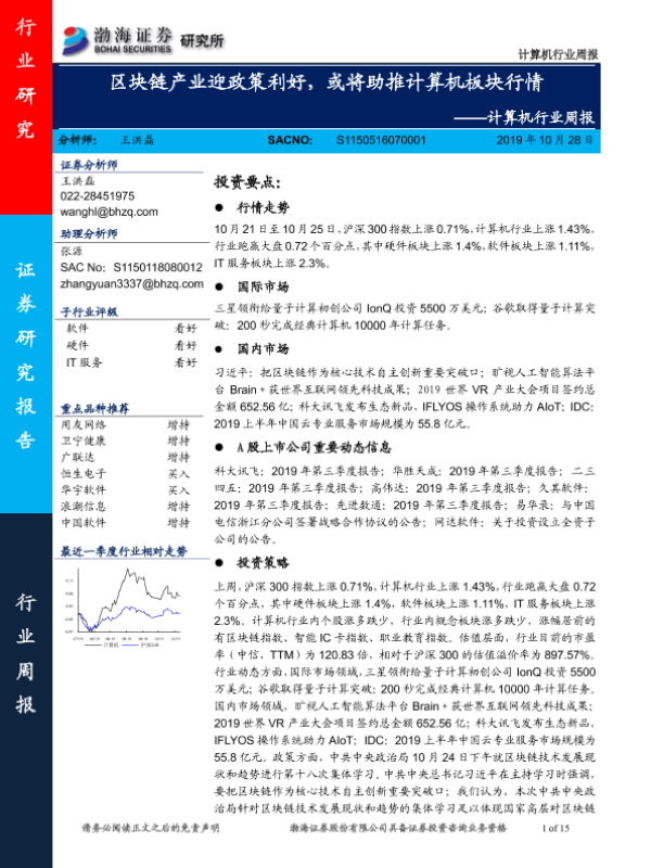 【渤海证券】【20191028】计算机行业周报:区块链产业迎政策利好,或将助推计算机板块行情-15页