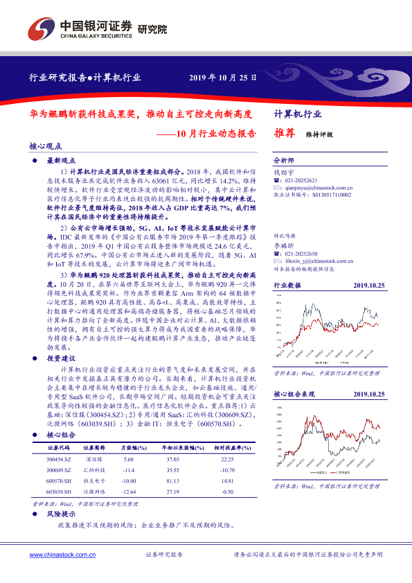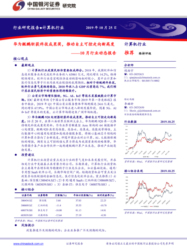 【银河证券】【20191025】20191025-中国银河-计算机行业10月行业动态报告:华为鲲鹏斩获科技成果奖,推动自主可控走向新高度-29页