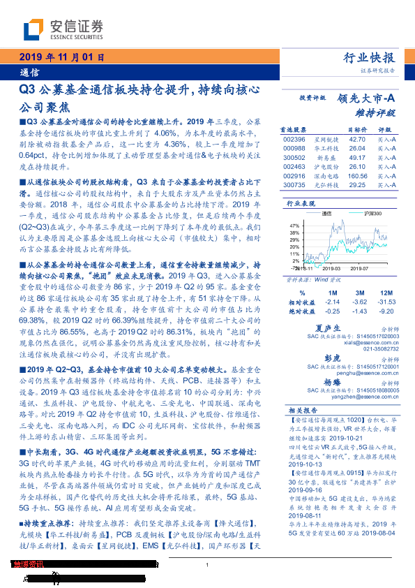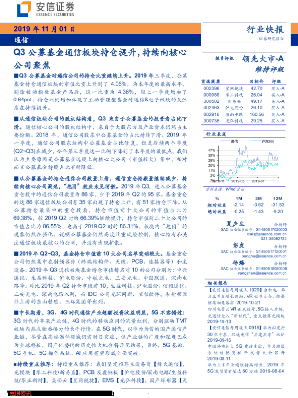 【安信证券】【20191101】Q3公募基金通信板块持仓提升,持续向核心公司聚焦-9页