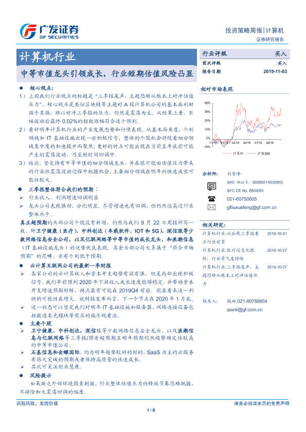 【广发证券】【20191103】20191103-广发证券-计算机行业投资策略周报:中等市值龙头引领成长,行业短期估值风险凸显-8页