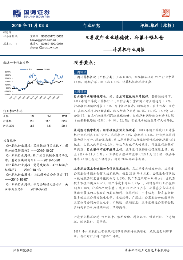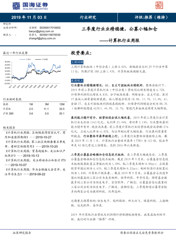 【国海证券】【20191103】计算机行业周报:三季度行业业绩稳健,公募小幅加仓-20页