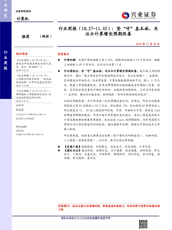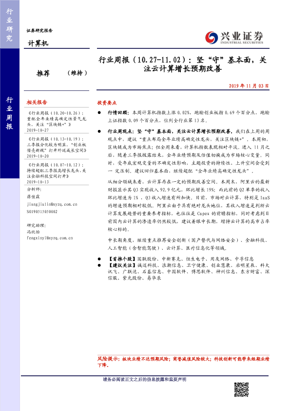 【兴业证券】【20191103】行业周报(10.27-11.02):坚“守”基本面,关注云计算增长预期改善-14页